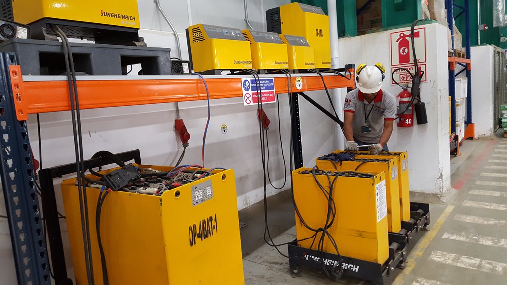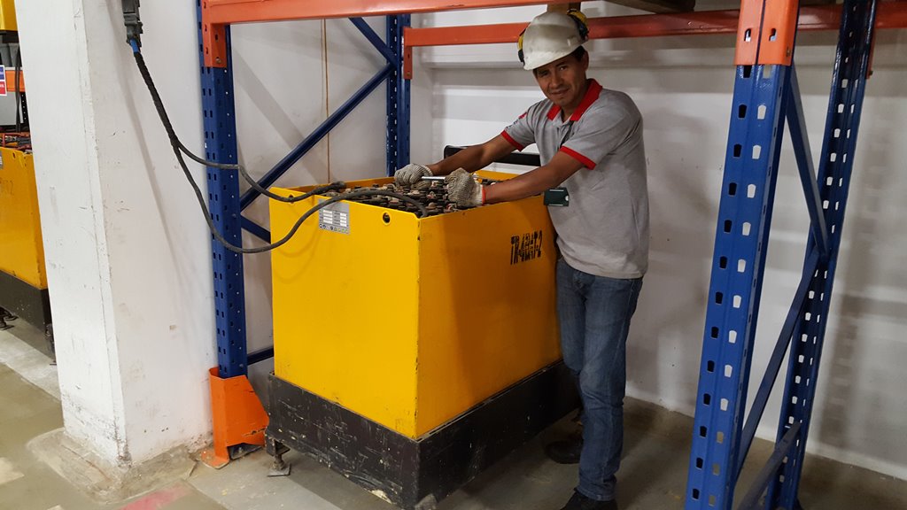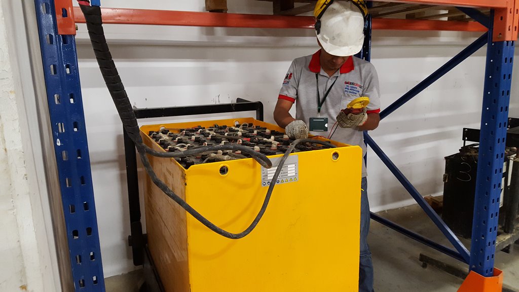 Nuestro personal altamente calificado realizando mantenimiento de baterias de 48 voltios y 24 voltios de apiladores electricos y traspaletas electicas en las marcas BT y JUNGHEINRICH