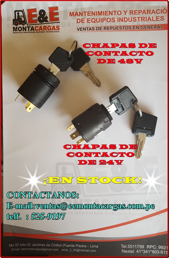 CONTAMOS CON UN STOCK DE CHAPAS DE CONTACTOS DE 48V Y 24V PARA APILADORES ELECTRICOS Y TRANSPALETAS ELECTRICAS EN LA MARCA "STILL", . ADEMAS CONTAMOS CON UNA GAMA DE REPUESTOS DE MAQUINAS COMO APILADORES, TRASPALETAS , MONTACARGAS, CARRETILLAS MANUALES, CONTRABALANCEADOS, ETC EN TODAS LAS MARCAS EXISTENTES EN EL PAIS.ESCRIBANOS AL CORREO PARA PODER COTIZARLO.